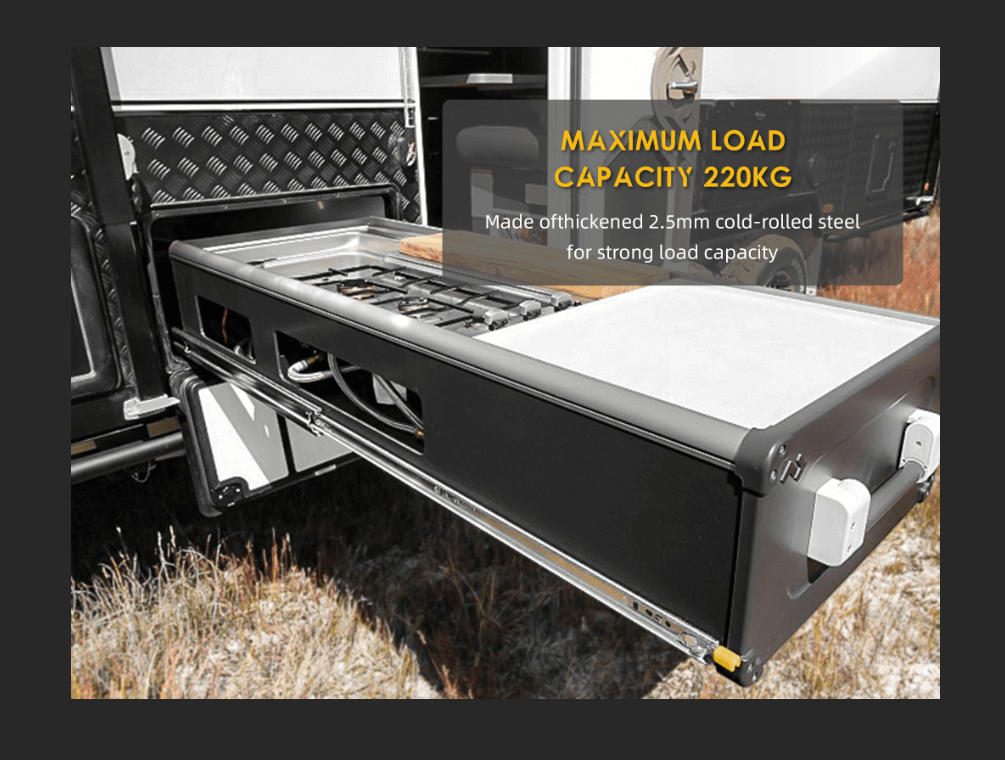 The heavy-duty drawer runners with locks can bear a maximum load of 220KG and can bear the weight of two adults. They are suitable for application scenarios such as telescopic beds, RV magic boxes, and industrial drawers.