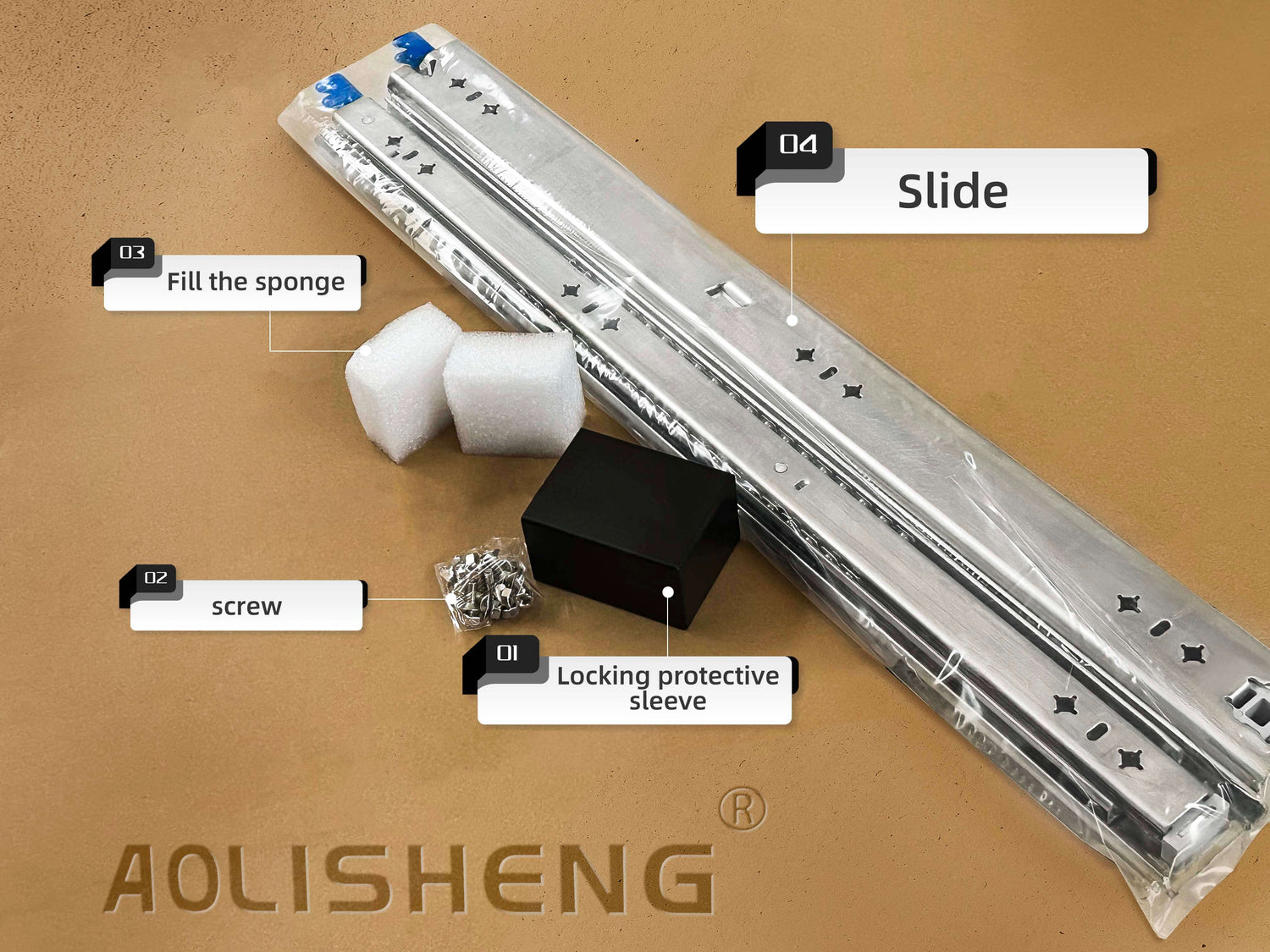 In the product packaging, for locked slide rails, we will have a lock protection cover to protect the lock and avoid damage to the drawer runners. Secondly, we will also provide screws for some special models of slide rails.